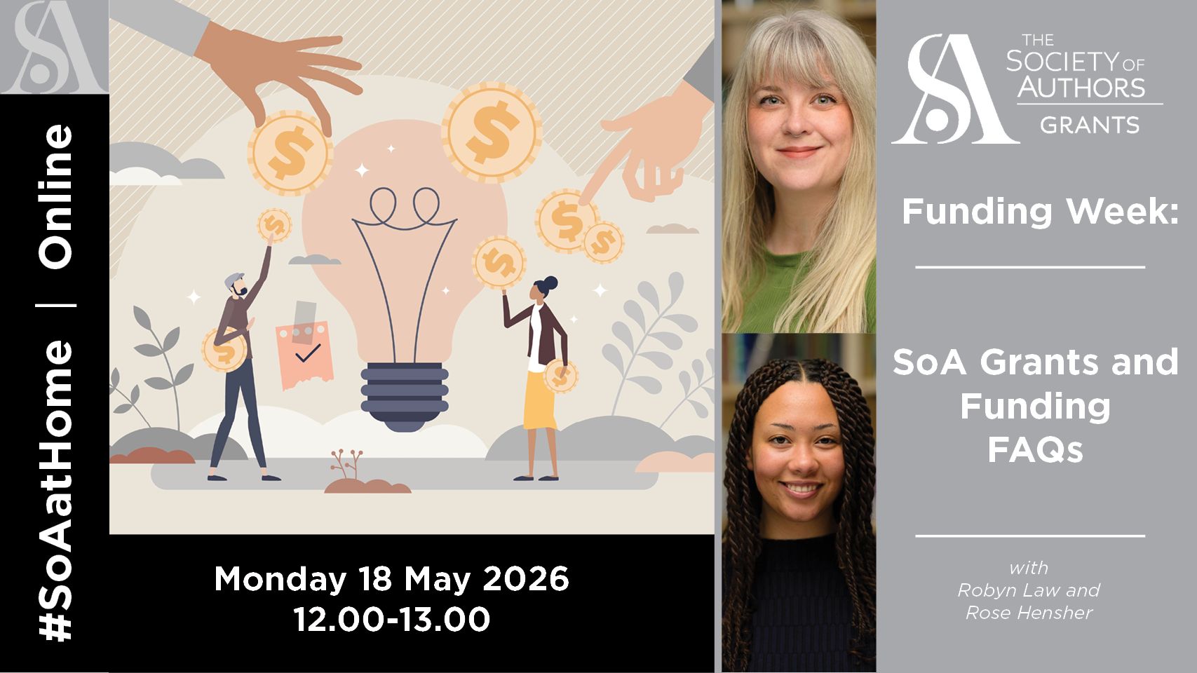 If you would like to send questions in advance, email grants@societyofauthors.org with ‘SoA Grants and Funding Event FAQs’ in the subject header. We will prioritise questions sent in advance and answer as many as we can from the audience on the day.